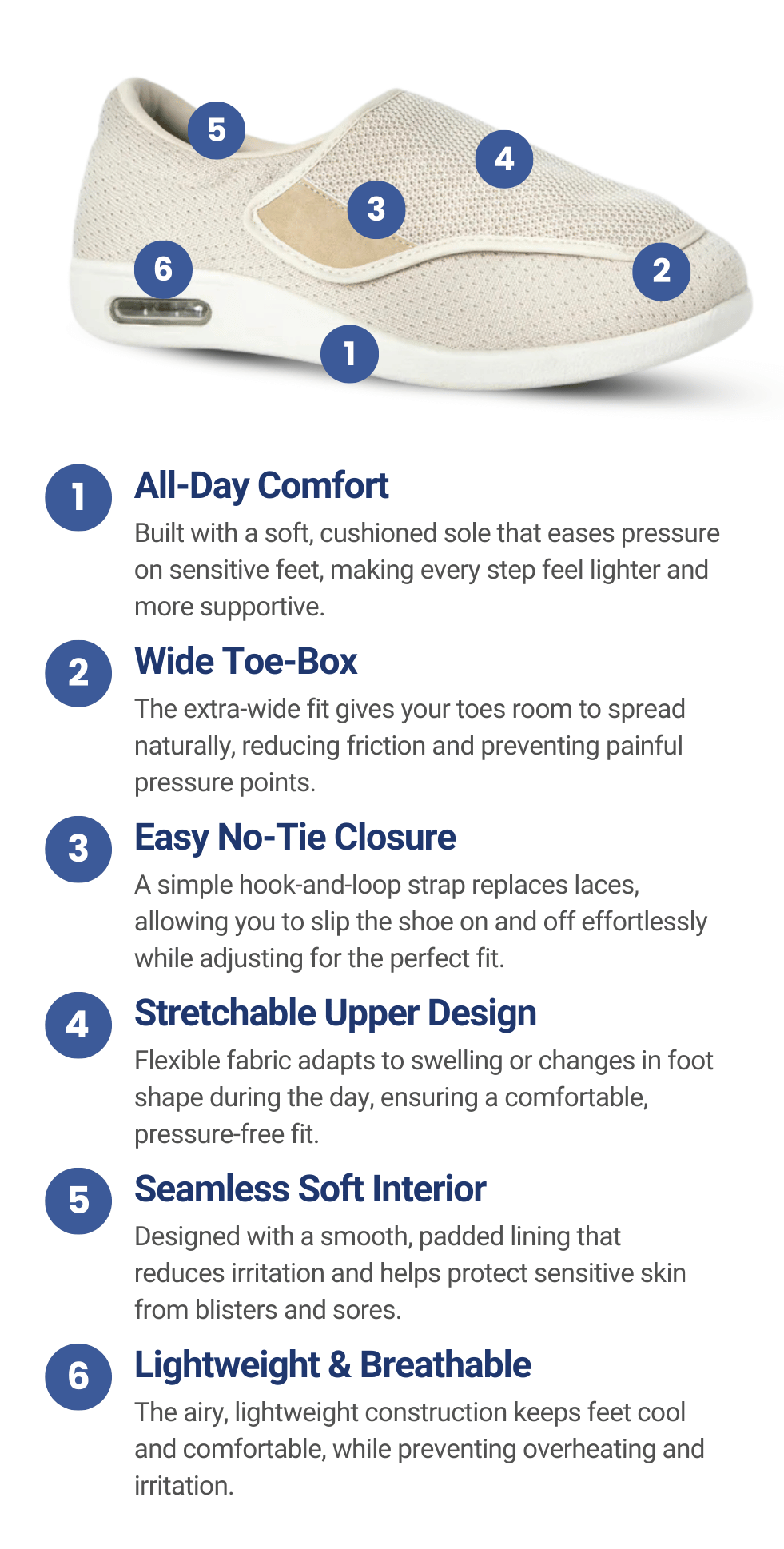 - Adjustable Stretch Uppers: Flexible, stretchable uppers adapt to swelling and foot shape, preventing tightness and ensuring a comfortable, circulation-friendly fit.